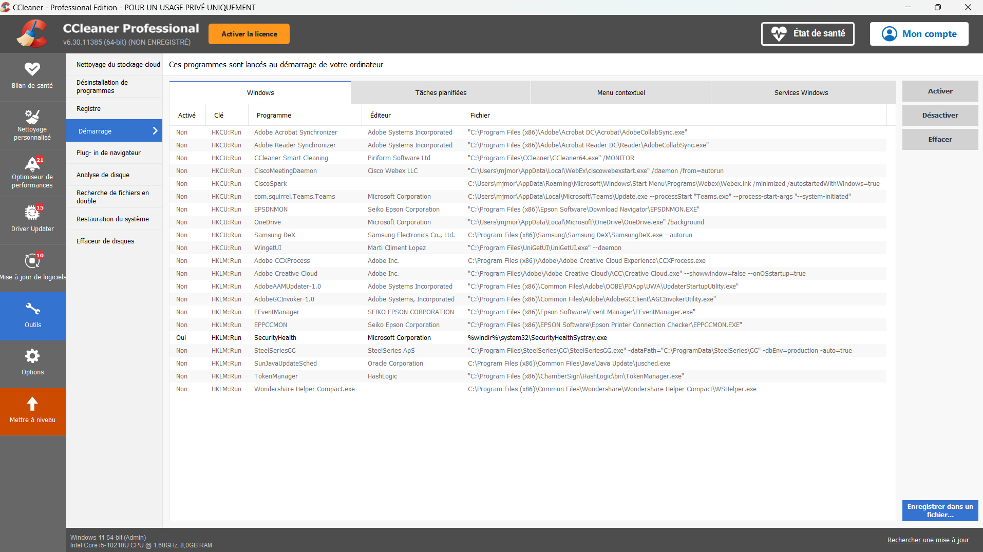 - Dans outils, vérifiez les application au démarrage de Windows : Désactivez toutes les inutiles (Adobe, CCleaner, Itune bonjour, etc)