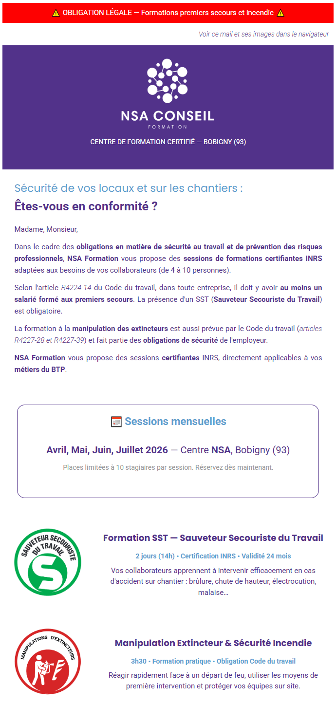 Création d'une newsletter emailing pour NSA Conseil Formation — Formations SST & Incendie
