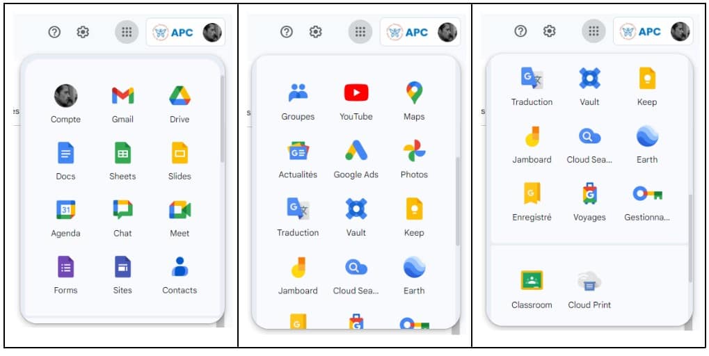 Une fois connecté avec vos identifiants APC vous disposez de tous les services Google.