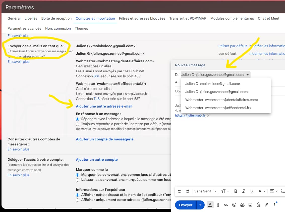 Il est possible de tout faire. Par exemple moi, sur mon adresse mail personnelle, je peux envoyer des mails en choisissant quelle adresse utiliser, tout en restant sur le même compte.