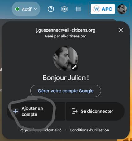 La deuxième solution est de se connecter avec les identifiants nom.prenom@all-citizens.org sur le navigateur Chrome. (Icône « avatar » en haut à droite du navigateur).