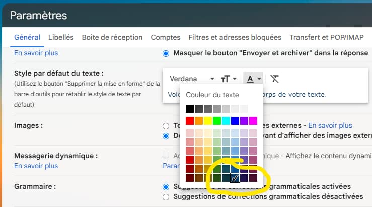 Dans Gmail, bouton “Paramètres” > “Tous les paramètres” > “Général” > ”Style par défaut du texte” : Verdana, couleur bleu foncé.