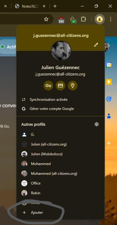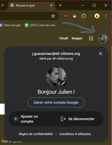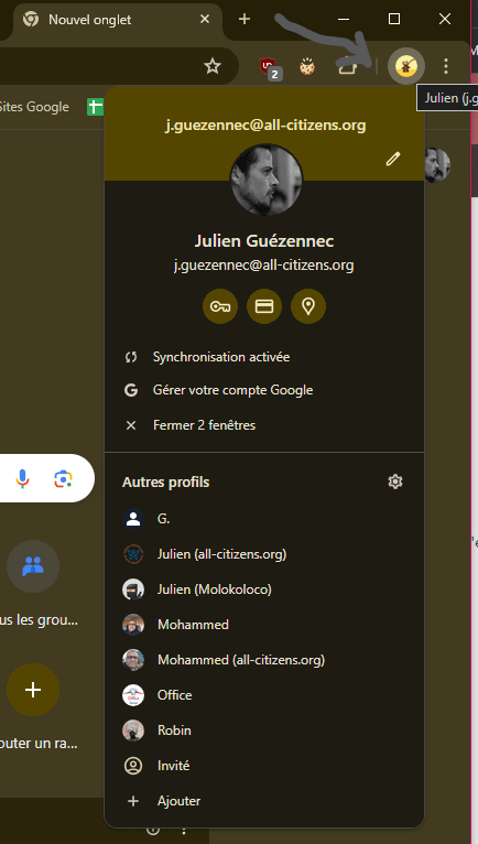 La deuxième solution est de se connecter avec les identifiants nom.prenom@all-citizens.org sur le navigateur Chrome. (Icône « avatar » en haut à droite du navigateur).