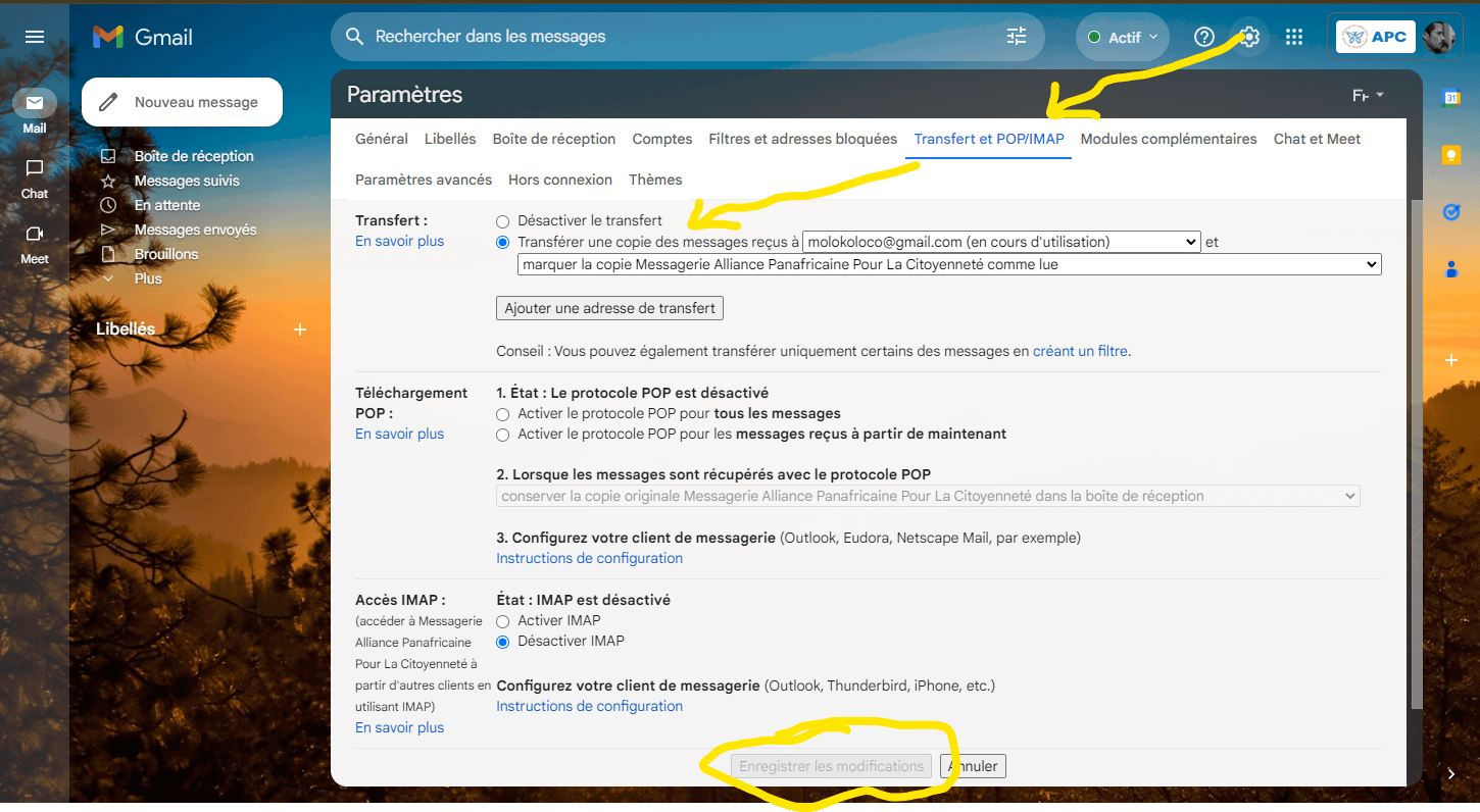 - Ensuite il faut choisir l’onglet “Transfert et POP/IMAP”.