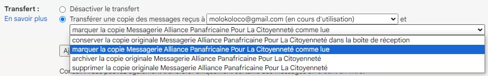 - Sur cette page, dans le premier champ de formulaire “Transfert :” vous pouvez “Ajouter une adresse de transfert”.