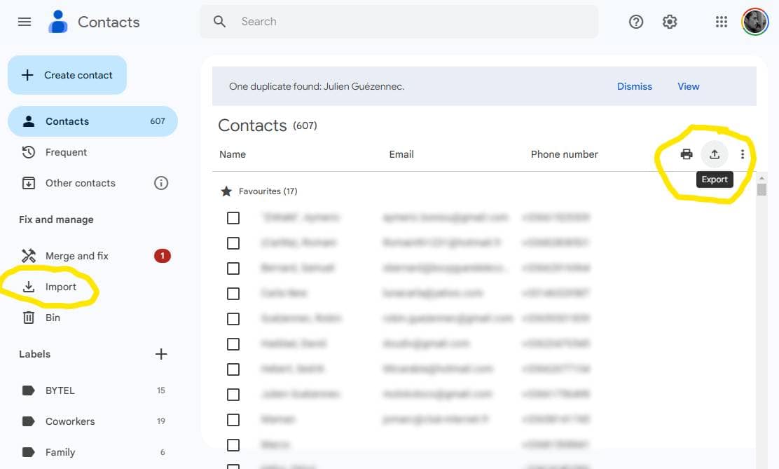 E) Importer exporter vos contacts (téléphones et mails)